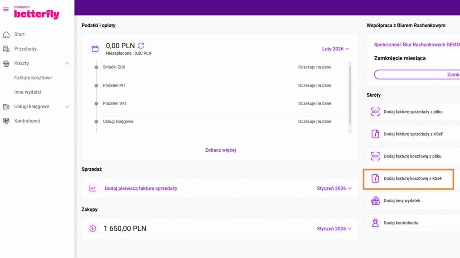 - Pełna integracja z KSeF, w tym przesyłka e-Faktur oraz pobieranie dokumentów kosztowych i korekt do jednego panelu