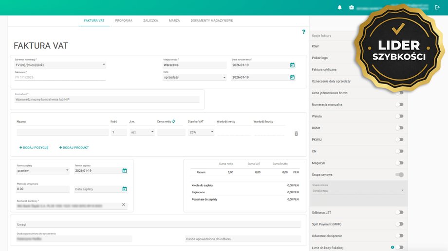 Faktura.pl to szybki i intuicyjny system do fakturowania z KSeF oraz rachunkowości online, obecny na rynku od 1999 roku. Rozwiązanie zostało zaprojektowane dla małych i średnich firm, freelancerów, JDG, e-commerce oraz biur rachunkowych, które potrzebują prostego, ale kompleksowego narzędzia do obsługi sprzedaży i dokumentów. To system, który pozwala wygenerować fakturę w mniej niż 7 sekund i równocześnie prowadzić uproszczoną księgowość, wytwarzać JPK oraz zarządzać dokumentacją online.