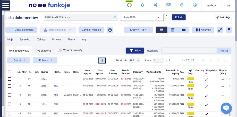 System łączy się z KSeF i automatycznie pobiera faktury z KSeF. Dokumenty są osiągalne w jednym panelu, gdzie można je zweryfikować, uzupełnić parametry księgowe i przekazać dalej do systemu finansowo-księgowego. Funkcja „Uzupełnij z AI” inteligentnie podpowiada parametry księgowe, typ dokumentu jak również historię zmian, co przyspiesza pracę i ogranicza liczbę manualnych czynności. W każdym pakiecie osiągalne są bezpłatne funkcjonalności KSeF, obejmujące pobieranie, przesyłanie i wizualizację faktur.