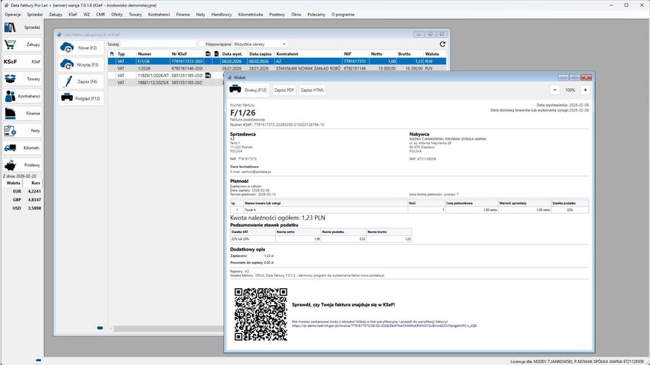 Data Faktury to stacjonarny system do faktur, który ma możliwość współpracy z bazą SQL i umożliwia błyskawiczne tworzenie dokumentów zgodnie z polskimi regulacjami. System został opracowany z myślą o małych i średnich firmach, które chcą zautomatyzować przesyłkę jak również odbiór e-Faktur i mieć pełną kontrolę nad dokumentami w jednym miejscu. Z rozwiązania korzystają zarówno mikro i małe przedsiębiorstwa, jak i większe podmioty oraz instytucje publiczne, które potrzebują sprawnej obsługi większej liczby dokumentów.