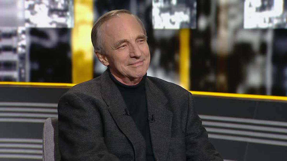 Mężczyzna w okularach i garniturze siedzący w studiu telewizyjnym, obok kolaż zdjęć polityków ściskających sobie ręce.