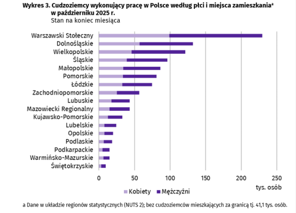 W ostatnim dniu października 2025 r. co piąty obcokrajowiec pracujący w Polsce zamieszkiwał w regionie warszawskim stołecznym (20,2%).