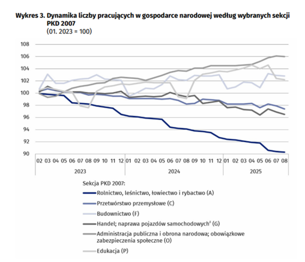 Pod koniec sierpnia 2025 r. populacja pracujących w gospodarce narodowej wynosiła 15 038,8 tys. osób. Analizując dane z GUS, widoczny jest jednak trend zniżkowy: