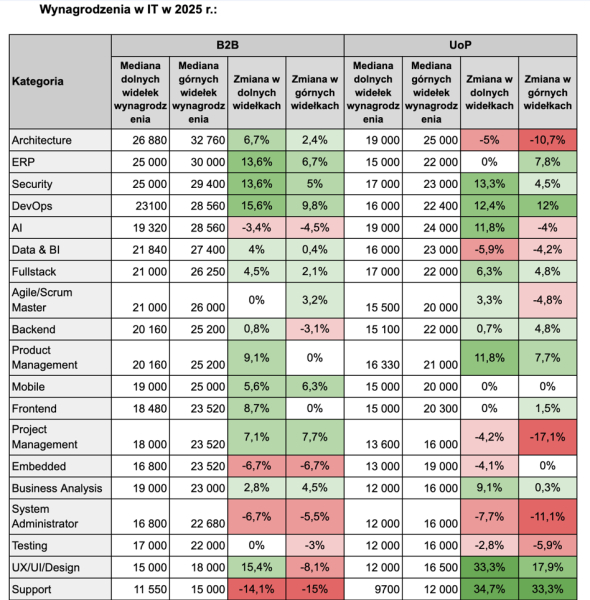 Poprzedni rok charakteryzował się podwyżkami płac w sektorze IT, aczkolwiek częściej w przypadku kontraktów B2B niż umów o pracę. Z właśnie opublikowanego raportu „Rynek pracy w IT2025” polskiego serwisu No Fluff Jobswynika, iż mediana najniższych granic wynagrodzeń powiększyłasię w odniesieniu do 13 z analizowanych 19grup. Z kolei w czterech zauważono progres górnych i dolnych zakresów,bez względu na rodzaj umowy.
