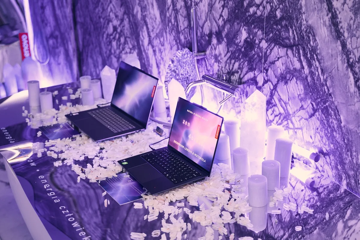 Instalacja „Aura Room” w pokoju nr 205 dawała możliwość uczestnikom zeskanowanie własnej aury i obserwowanie jej wizualizacji na ekranie – w postaci barw i pulsujących struktur inspirowanych laptopami Lenovo Aura Edition. Z kolei „Zen Forest”, stworzony w salonie marki, przekształcił technologiczną przestrzeń w zieloną oazę z żywymi roślinami, ambientową muzyką i interaktywnymi elementami sprzyjającymi relaksowi. Oba projekty powstały w ramach konceptu „Flow”, stworzonego we współpracy z kolektywem ArtIntell.
